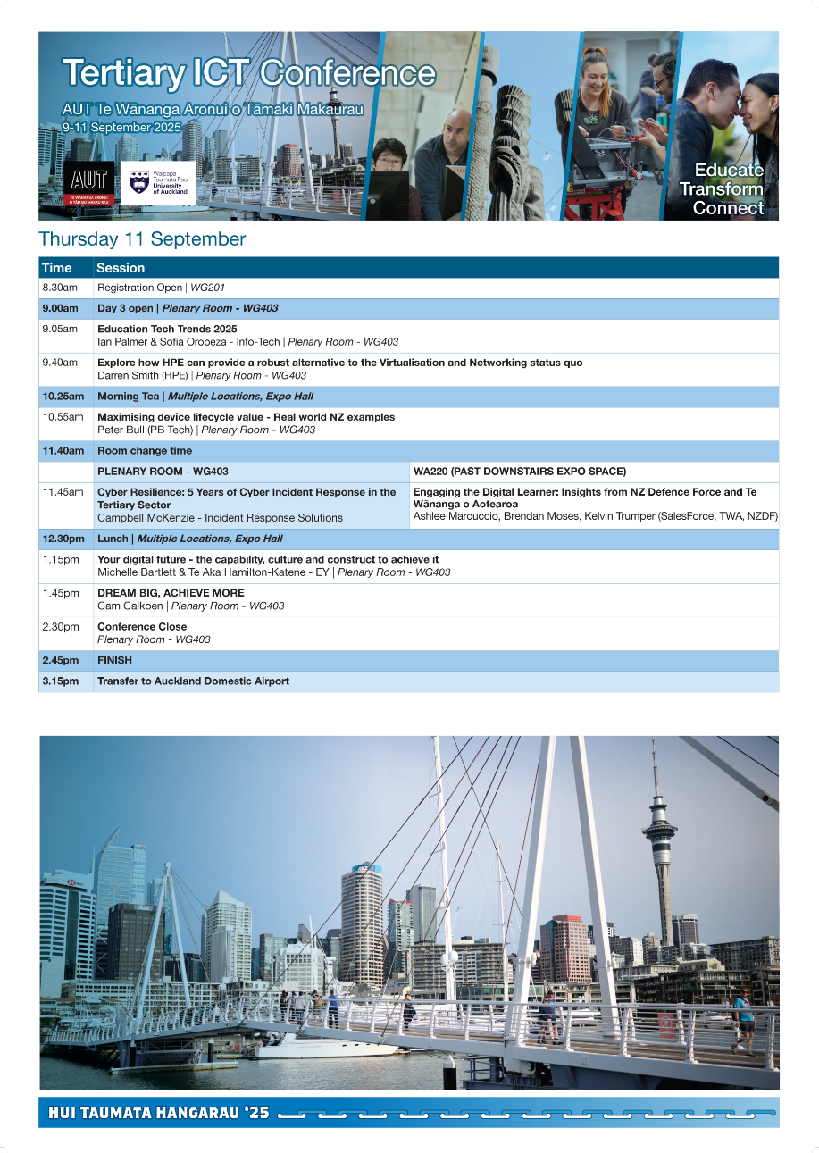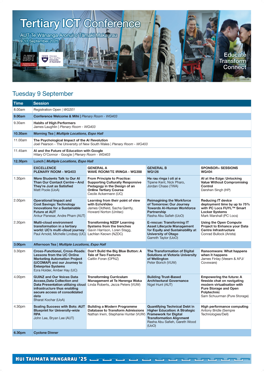 While we’re working on the programme for Tertiary ICT Conference 2026, the 2025 programme is available below and provides a helpful guide to the overall structure, flow, and timing of the conference.